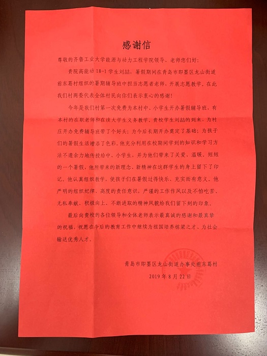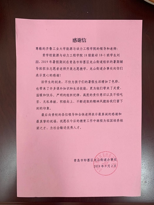 近日,皇冠正规娱乐平台收到两封感谢信,分别来自青岛市即墨区龙山街道办事处和青岛市即墨区龙山街道办事处前东葛村,信中对我院能动18-1班学生刘喆在暑期辅导班中担当志愿者老师表示感谢。