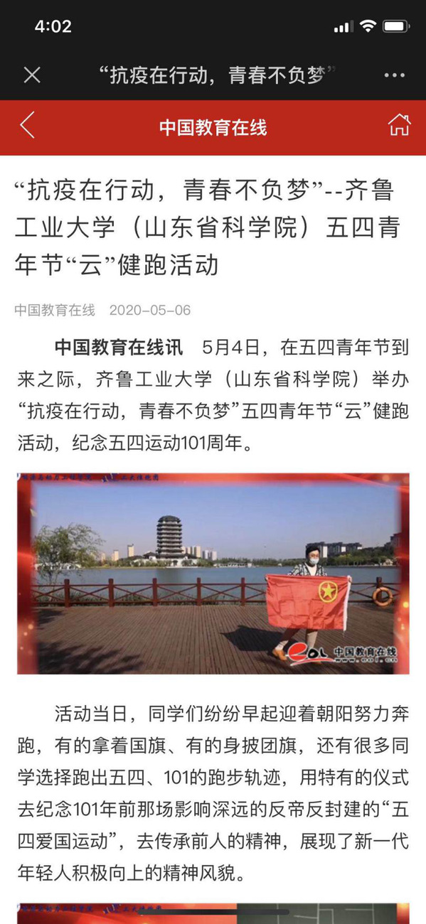 【中国教育在线】“抗疫在行动,青春不负梦”--齐鲁工业大学(山东省科学院)五四青年节“云”健跑活动