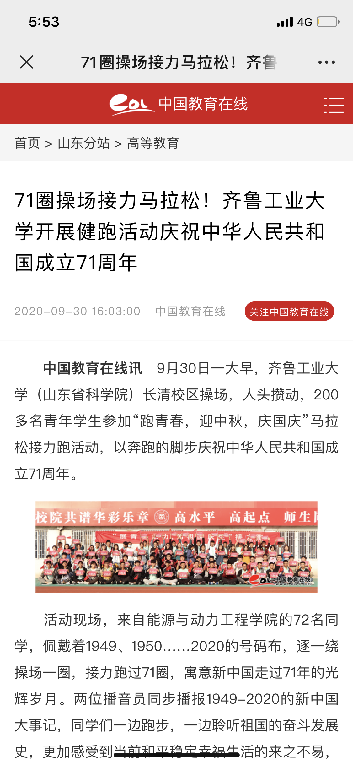 【中国教育在线】71圈操场接力马拉松!齐鲁工业大学开展健跑活动庆祝中华人民共和国成立71周年