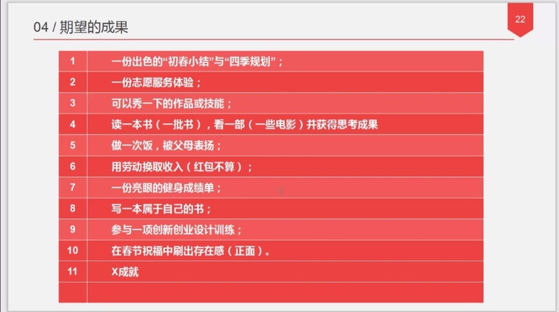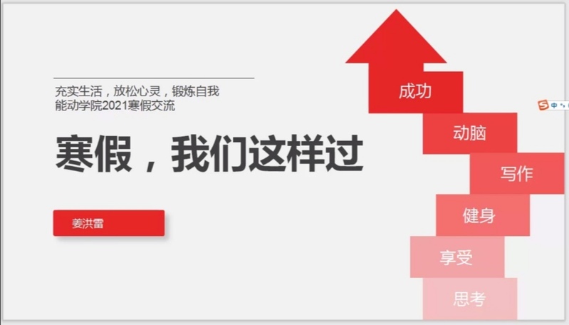 会议伊始,姜洪雷对同学们表达了亲切的问候,并询问大家假期第一周的生活状态与感受;随后,他通过对比两种截然不同的假期生活方式,向同学们传达了“5+X寒假生活超市”的核心内涵——“思考、享受、健身、写作、动脑、成功”;接下来,姜洪雷从四大部分具体介绍“生活超市”的主要内容,包含5项必需完成的任务与可供同学们自由选择的“X”项特殊作业,期间,他以自身为例,生动而详尽地介绍了作业的基本要求;最后,他就健身与写作做出了详细说明,并引出“会写”和“善跑”两个特色训练营,通过训练营打卡的方式极大地调动了同学们参与的热情与积极性。