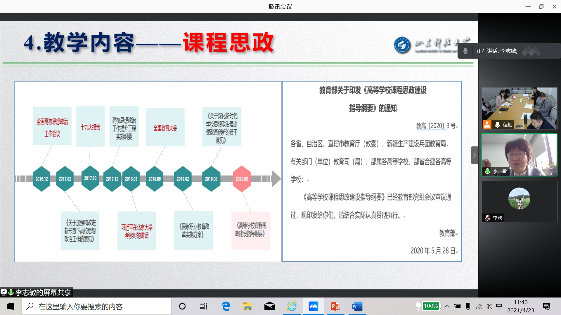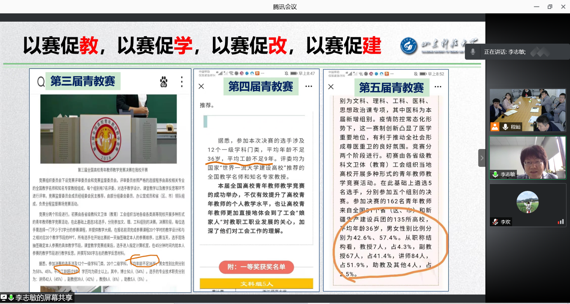 为提高青年教师教学能力,指导青年教师教学比赛,4月23日皇冠正规娱乐平台组织召开了青年教师教学能力提升座谈会。全国高校青年教师教学竞赛二等奖获得者、山东科技大学教学名师李志敏教授应邀做了主题报告,学院全体教师参加了此次会议。会议由学院教学负责人程屾主持。
