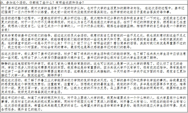 活动结束后,新生们纷纷表示受益匪浅,并对接下来的大学生活充满了无限的期待。能动21-1班徐亚男谈到:“听完书记的分享,我受益颇多。有些羞愧,因为我就是那个睡到中午,每天浑浑噩噩度过大半个假期的人。可又感到庆幸,离开学还有两周,现在开始并不算晚。感觉书记是个特别热爱生活又积极向上的人,希望以此做榜样,努力学习,将激励内化为动力,成为合格的大学生,成为更优秀的人。”能动21-2班李富晓说:“书记建议我们多元发展,跑步健身,多元交流,注重创新。学院院风是融动能通,我们要动起来,做人处事,要光明正大,为人大方,友善待人。这堂课给我们还未踏入校园的大一新生做了一个良好的铺垫。带着美好的憧憬,期待九月的相遇。”