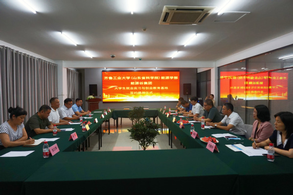 双方围绕人才需求、岗位实习、零碳校园合作等方面深入座谈,刘志刚与贺军代表双方共同签订了齐鲁工业大学“大学生就业实习与创业教育基地”合作协议并揭牌。