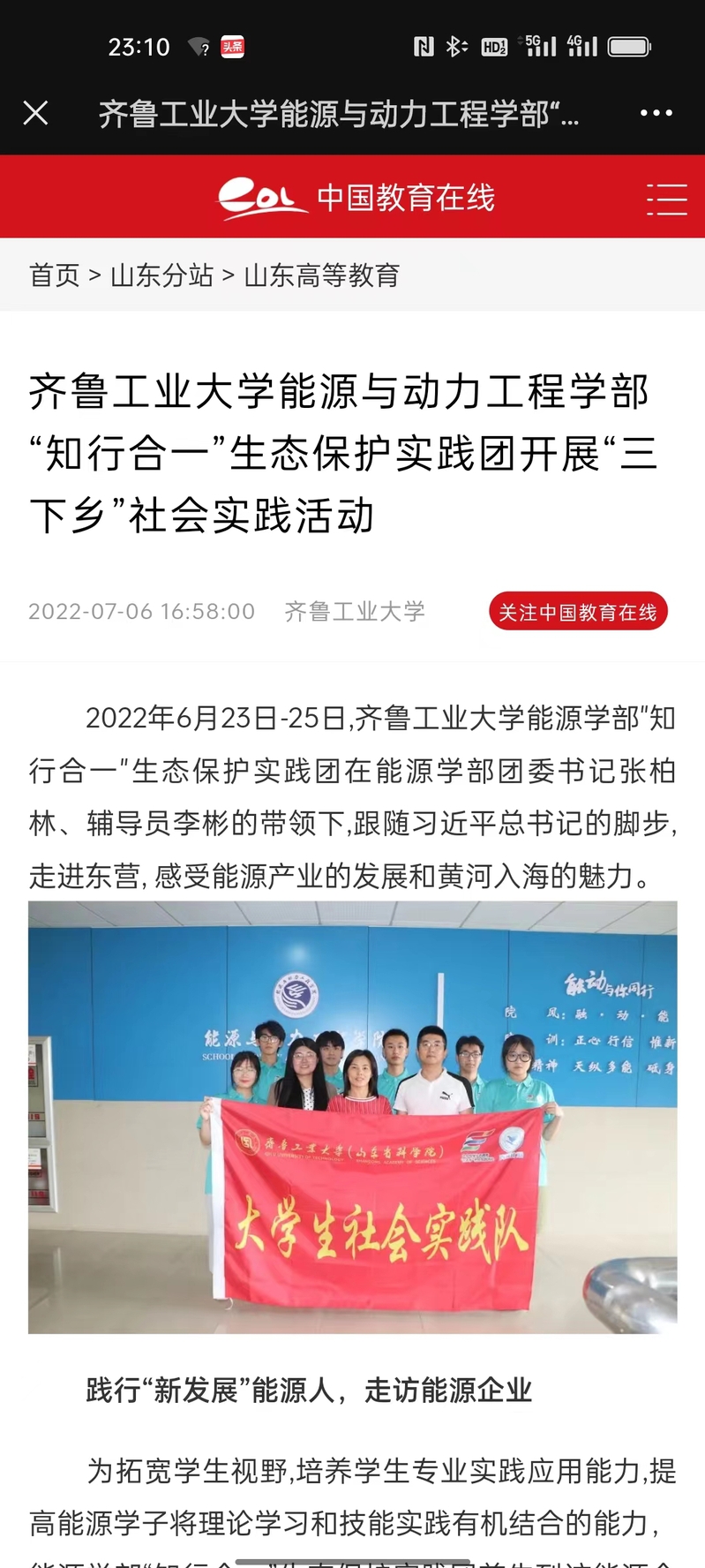 【中国教育在线】齐鲁工业大学皇冠正规娱乐平台“知行合一”生态保护实践团开展“三下乡”社会实践活动