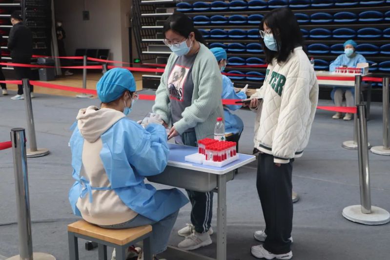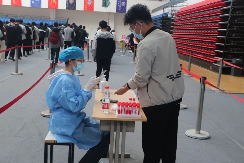 核酸检测现场,志愿者们耐心引导同学们出示健康码、协助信息采集人员进行身份核查、信息登记和维持现场秩序等工作,保证全员核酸检测工作高效有序进行。