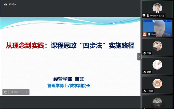 最后,经管学部副主任苗旺做了题为《从理念到行动:课程思政再认知与“四步法”实施路径》的专题讲座,他用大量生动的思政教育案例倡导老师们关注学生的价值塑造,读懂课程思政的内涵,从而真正立德树人,成为学生成长的引路人。