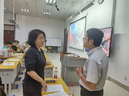 在彩石校区教学楼南116教室,刘素香认真听取了金付强老师为2021级能源与动力工程专业学生讲授的《泵与风机》课程。在课堂上,她关注课堂教学状况、了解教学设施教学环境、学生学习状态等,并在课后与教师进行了现场交流。刘素香在对授课成效充分肯定的同时,就如何更好地提高教学质量提出了建议。她鼓励教师在教学研究、教学方法改革等方面积极探索,在课堂内容融入课程思政元素,优化课程思政内容供给,深挖思政教育资源,发挥好每门课程的育人作用。