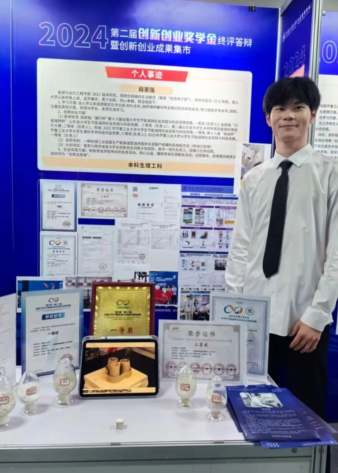 段家强同学2023—2024年曾获“建行杯”第十六届全国大学生节能减排社会实践与科技竞赛国赛一等奖,“力诺瑞特杯”山东省大学生节能减排社会实践与科技竞赛省赛三等奖,并申请发明专利1项--“一种利用工业固废生产耐高温型油井固井水泥联产硫磺的系统和方法”。
