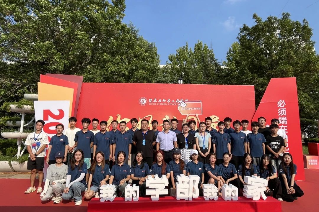 部分新生身穿文化衫在学部迎新主题展板前拍照留念,记录难忘一刻。
