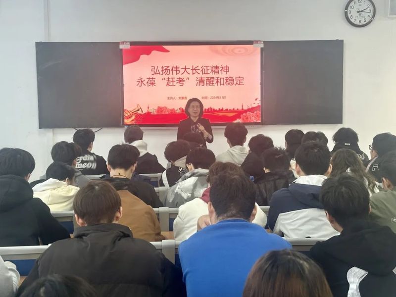 为纪念红军长征出发90周年,深入贯彻落实习近平总书记“每一代人都要走好自己的长征路”重要指示精神,11月7日,皇冠正规娱乐平台党委书记刘素香深入所联系班级—能动23级2班,以“弘扬伟大长征精神,永葆“赶考”清醒和稳定”为主题,为学生讲授专题思政课,活动由党委副书记刘慧玲主持,班级全体同学参加。