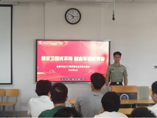 宣讲会伊始,甄广轩简要介绍了本次宣讲活动的目的和意义,强调了大学生参军入伍对于个人成长和国防建设的重要性。随后,甄广轩针对毕业生关注的参军发展前途、学历提升、就业保障、经济补助以及其他优待政策事项进行介绍,详细讲解了征兵的基本要求、报名流程、服役待遇以及发展前景。同时,他结合自身参军入伍的经历,从初入军营的艰苦训练,到执行任务的热血瞬间,用自身蜕变诠释军队对意志的磨炼、对品格的塑造,让在场同学深刻感受到军旅生活的魅力与军人肩负的责任。