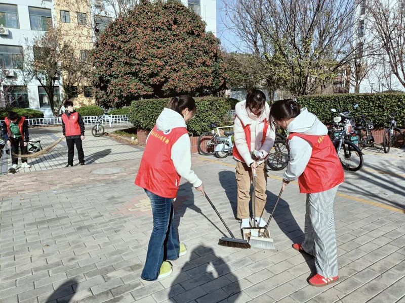 活动现场,志愿者们分工明确,分组进行广场不同区域的清扫。志愿者们手持扫帚、垃圾袋等工具,捡拾草丛中夹杂的落叶与杂物,并合力将装满落叶的垃圾袋搬运至指定回收点。经过一下午的辛勤劳作,学生公寓前的广场焕然一新。原本散落各处的落叶被清理干净,路面整洁通畅,草丛中不再夹杂杂物,志愿者们同时将公寓前电动车全部摆放整齐,为师生日常出行营造了安全舒心的环境。
