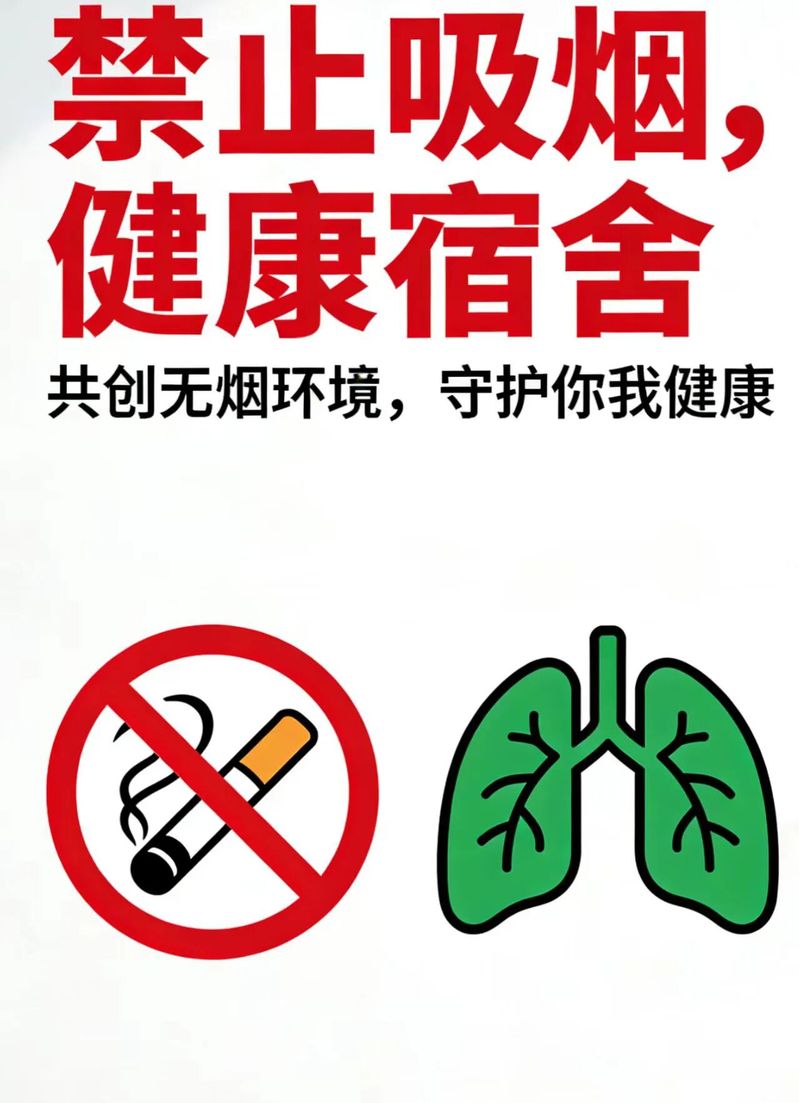 四、携手监督,共护家园。鼓励各班级、宿舍禁烟监督员认真履职,党员和学生骨干带头示范。同学们应相互提醒、彼此监督,发现违规行为及时劝阻,共同营造“人人参与、人人负责”的禁烟氛围,让无烟成为宿舍生活的常态。