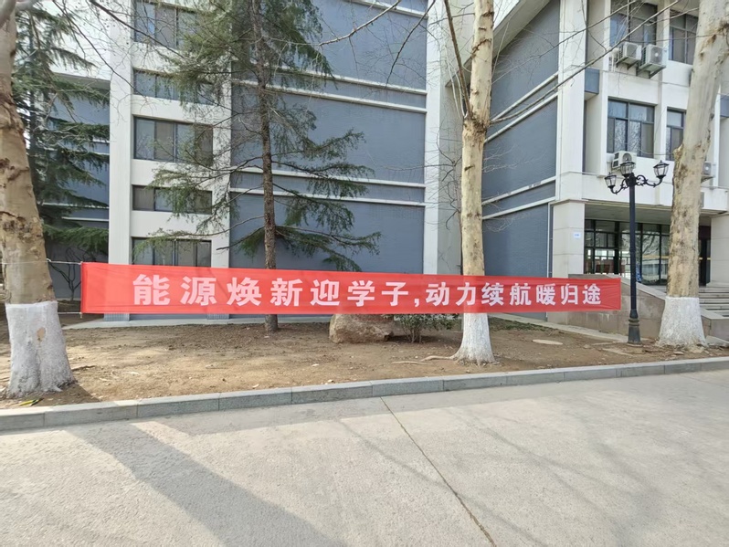 早在同学们返校之前,校园的主干道和教学楼下,已悄然挂起了一幅幅红色条幅。这些条幅,既有欢迎回家的朴实温暖,也有乘风破浪的励志期许。字句醒目,情意绵长,陪伴大家迈入又一个崭新的春天。